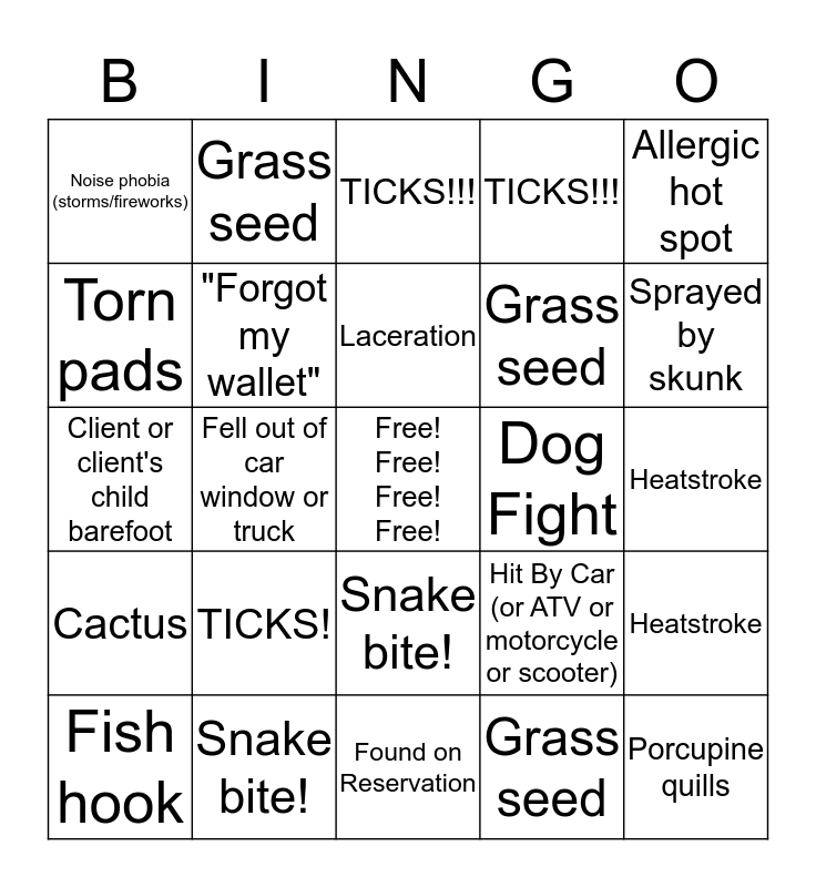 This bingo card has a free space and 24 words: TICKS!, Snake bite!, Laceration, Fish hook, Allergic hot spot, Noise phobia (storms/fireworks), Torn pads, Grass seed, Dog Fight, Snake bite!, Grass seed, Client or client's child barefoot, Hit By Car (or ATV or motorcycle or scooter), Heatstroke, "Forgot my wallet", Grass seed, Heatstroke, TICKS!!!, Sprayed by skunk, Fell out of car window or truck, Porcupine quills, Cactus, TICKS!!! and Found on Reservation.