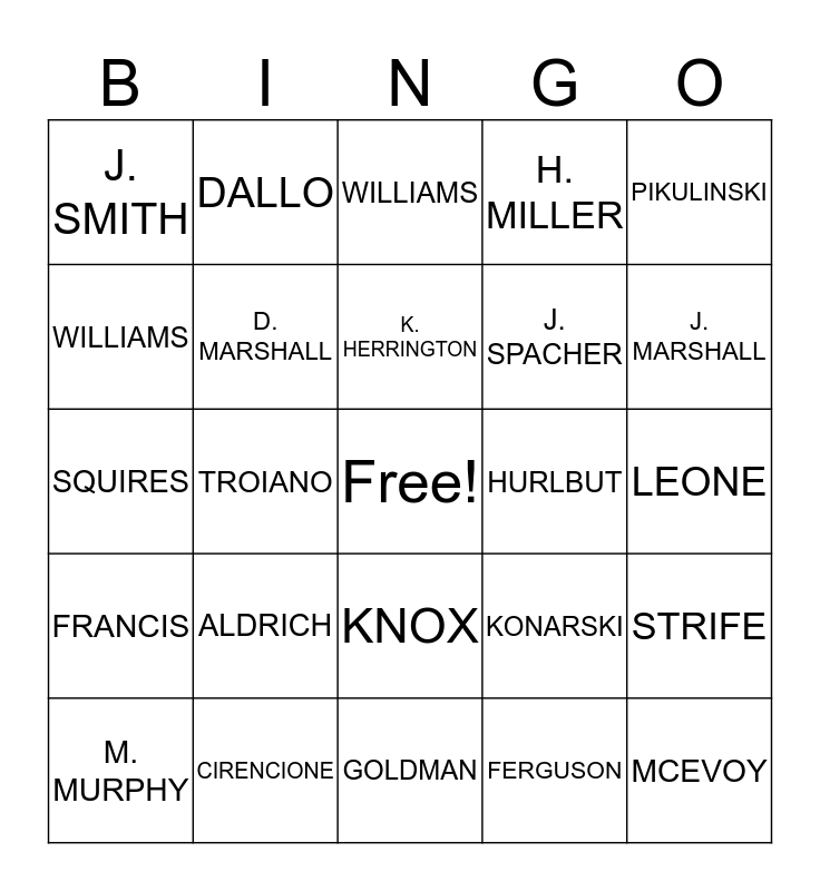 This bingo card has a free space and 24 words: ALDRICH, CIRENCIONE, K. HERRINGTON, M. MURPHY, PIKULINSKI, J. SMITH, WILLIAMS, DALLO, HURLBUT, KNOX, J. SPACHER, SQUIRES, KONARSKI, STRIFE, D. MARSHALL, FERGUSON, LEONE, WILLIAMS, J. MARSHALL, TROIANO, MCEVOY, FRANCIS, H. MILLER and GOLDMAN.