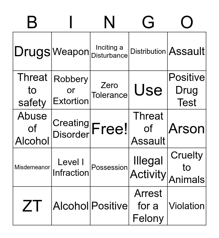 This bingo card has a free space and 24 words: Level I Infraction, Alcohol, Zero Tolerance, ZT, Assault, Drugs, Threat to safety, Weapon, Threat of Assault, Possession, Use, Abuse of Alcohol, Illegal Activity, Cruelty to Animals, Robbery or Extortion, Arrest for a Felony, Arson, Inciting a Disturbance, Positive Drug Test, Creating Disorder, Violation, Misdemeanor, Distribution and Positive.