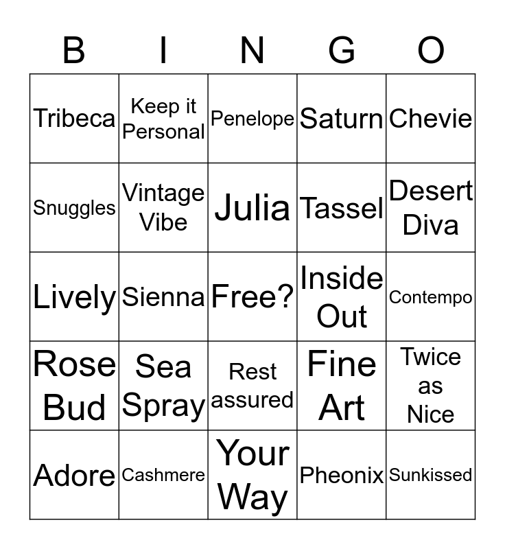 This bingo card has a free space and 24 words: Sea Spray, Cashmere, Julia, Adore, Chevie, Tribeca, Snuggles, Keep it Personal, Inside Out, Rest assured, Tassel, Lively, Fine Art, Twice as Nice, Vintage Vibe, Pheonix, Contempo, Penelope, Desert Diva, Sienna, Sunkissed, Rose Bud, Saturn and Your Way.