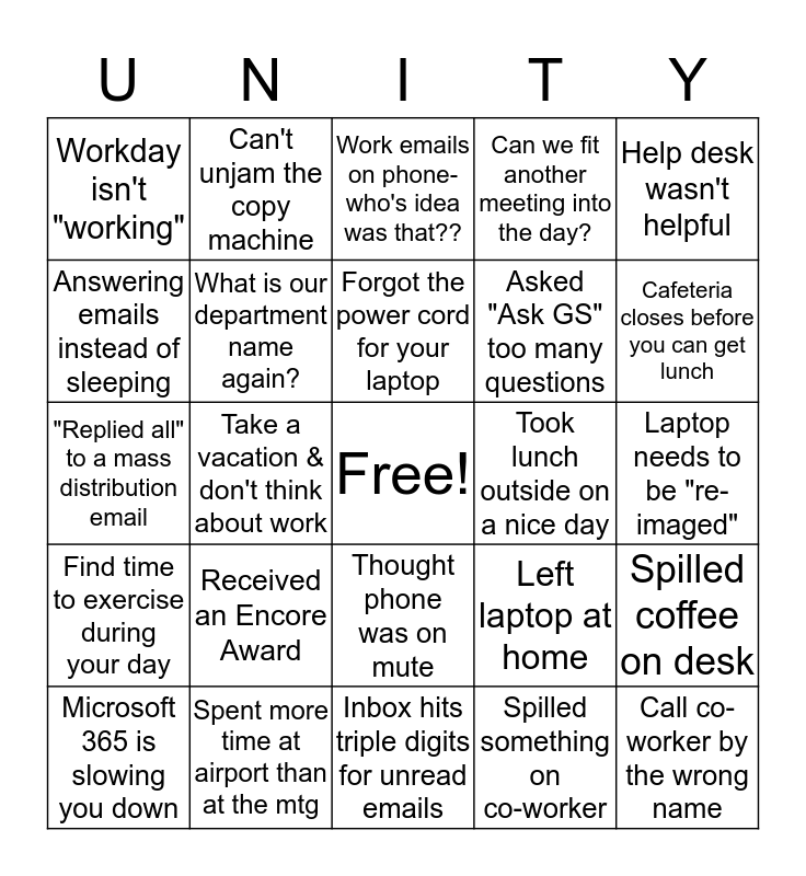 This bingo card has a free space and 24 words: Received an Encore Award, Spent more time at airport than at the mtg, Forgot the power cord for your laptop, Microsoft 365 is slowing you down, Help desk wasn't helpful, Workday isn't "working", Answering emails instead of sleeping, Can't unjam the copy machine, Took lunch outside on a nice day, Thought phone was on mute, Asked "Ask GS" too many questions, "Replied all" to a mass distribution email, Left laptop at home, Spilled coffee on desk, What is our department name again?, Spilled something on co-worker, Laptop needs to be "re-imaged", Work emails on phone-who's idea was that??, Cafeteria closes before you can get lunch, Take a vacation & don't think about work, Call co-worker by the wrong name, Find time to exercise during your day, Can we fit another meeting into the day? and Inbox hits triple digits for unread emails.
