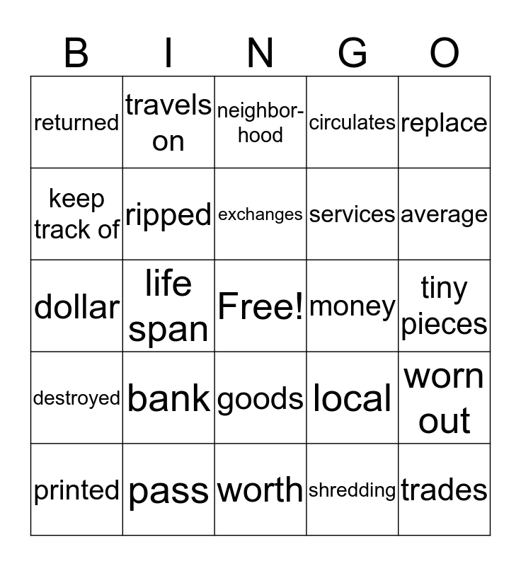 This bingo card has a free space and 24 words: bank, pass, exchanges, printed, replace, returned, keep track of, travels on, money, goods, services, dollar, local, worn out, ripped, shredding, tiny pieces, neighbor- hood, average, life span, trades, destroyed, circulates and worth.