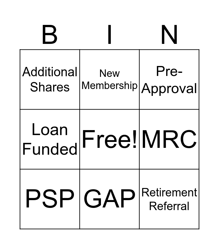 This bingo card has a free space and 8 words: MRC, Pre-Approval, New Membership, PSP, Additional Shares, Retirement Referral, Loan Funded and GAP.