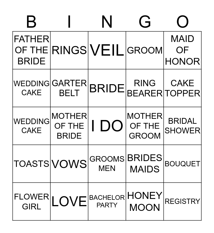 This bingo card has a free space and 24 words: VOWS, LOVE, BRIDE, FLOWER GIRL, MAID OF HONOR, FATHER OF THE BRIDE, WEDDING CAKE, RINGS, MOTHER OF THE GROOM, GROOMS MEN, RING BEARER, WEDDING CAKE, BRIDES MAIDS, BOUQUET, GARTER BELT, HONEY MOON, BRIDAL SHOWER, VEIL, CAKE TOPPER, MOTHER OF THE BRIDE, REGISTRY, TOASTS, GROOM and BACHELOR PARTY.