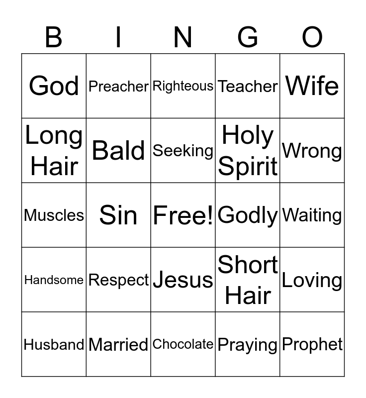 This bingo card has a free space and 24 words: Respect, Married, Seeking, Husband, Wife, God, Long Hair, Preacher, Godly, Jesus, Holy Spirit, Muscles, Short Hair, Loving, Bald, Praying, Waiting, Righteous, Wrong, Sin, Prophet, Handsome, Teacher and Chocolate.