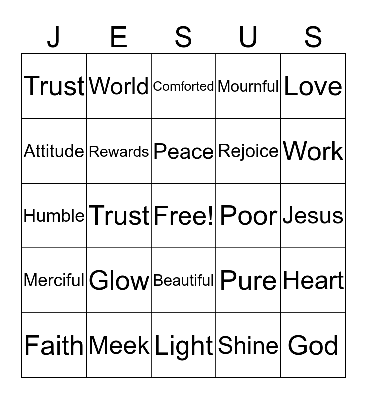 This bingo card has a free space and 24 words: Glow, Meek, Peace, Faith, Love, Trust, Attitude, World, Poor, Beautiful, Rejoice, Humble, Pure, Heart, Rewards, Shine, Jesus, Comforted, Work, Trust, God, Merciful, Mournful and Light.