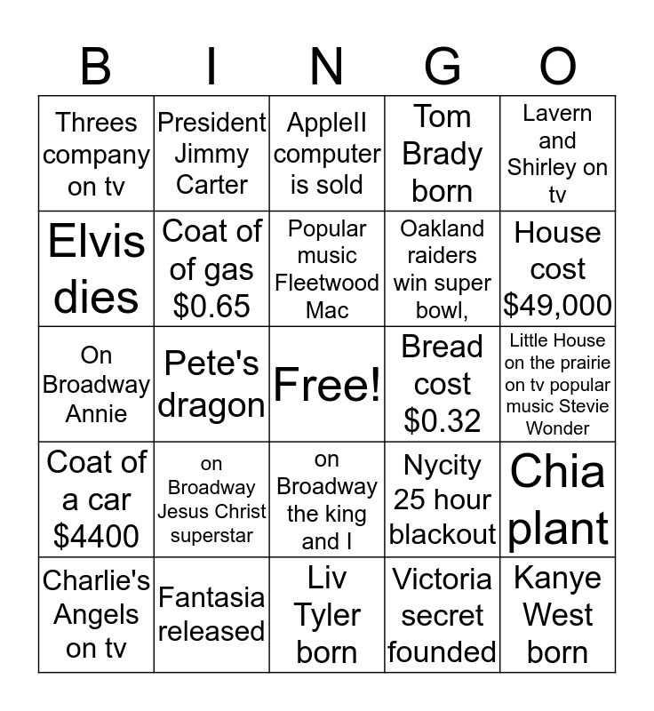 This bingo card has a free space and 33 words: Starwars, The rescuers, Pete's dragon, World Trade center complete, Coat of a car $4400, Coat of of gas $0.65, Lavern and Shirley on tv, Charlie's Angels on tv, President Jimmy Carter, Popular music The Eagles, Popular music Fleetwood Mac, AppleII computer is sold, Smoky and the bandit, Rocky, Bread cost $0.32, House cost $49,000, Fantasia released, On Broadway Annie, on Broadway Jesus Christ superstar, Nycity 25 hour blackout, on Broadway the king and I, Herbie goes to Monte Carlo released, Threes company on tv, Little House on the prairie on tv popular music Stevie Wonder, Liv Tyler born, Kanye West born, Tom Brady born, Oakland raiders win super bowl,, Elvis dies, Chia plant, MRI scanner, Victoria secret founded and slim fast.