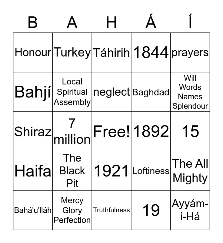 This bingo card has a free space and 24 words: The Black Pit, Mercy Glory Perfection, neglect, Bahá'u'lláh, prayers, Honour, Bahjí, Turkey, 1892, 1921, Baghdad, Shiraz, Loftiness, The All Mighty, Local Spiritual Assembly, 19, 15, Táhirih, Will Words Names Splendour, 7 million, Ayyám-i-Há, Haifa, 1844 and Truthfulness.