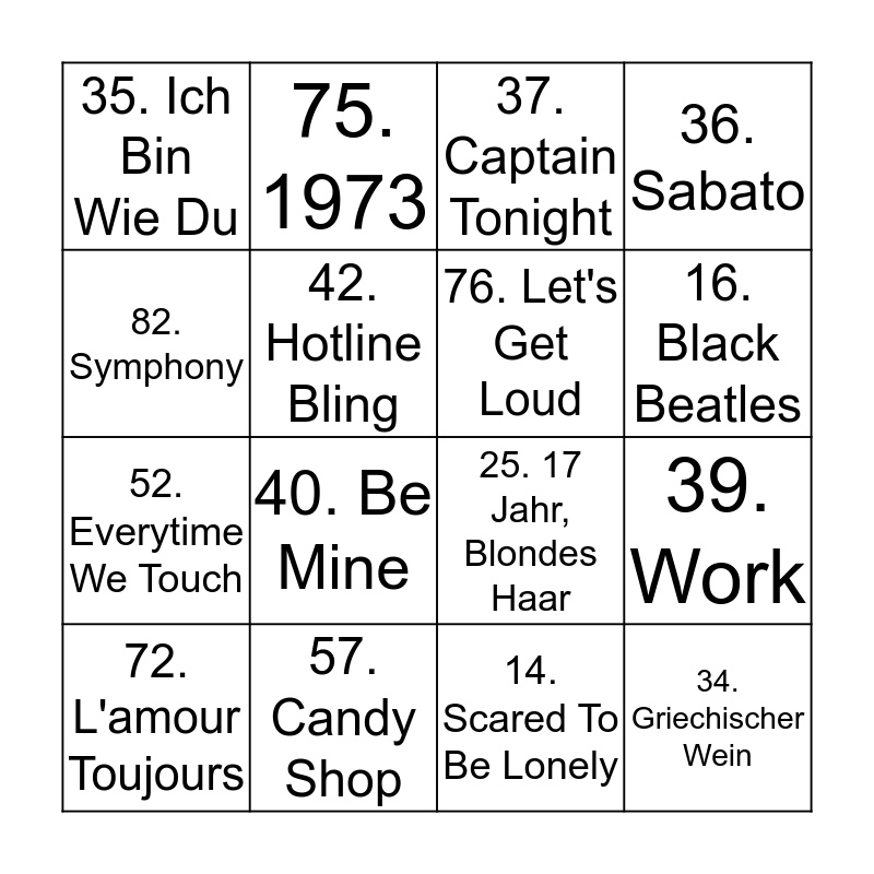 This bingo card has 90 words: 01. Rockabye, 02. Solo Dance, 03. Shape Of You, 04. You Don't Know Me, 05. It Ain't Me, 06. I Can Be The One, 07. Chained To The Rhythm, 08. Suavemente, 09. Summer On You, 10. Fast Car, 11. Hula Hoop, 12. Sofia, 13. Swalla, 14. Scared To Be Lonely, 15. Cheap Trills, 16. Black Beatles, 17. It Ain't My Fault, 18. 24K Magic, 19. In The Name Of Love, 20. This Is What You Came For, 21. Faded, 22. Duele El Corazon, 23. I Ain't Your Mama, 24. Scars To Your Beautiful, 25. 17 Jahr, Blondes Haar, 26. All I Want For Christmas, 27. Don't Let Me Down, 28. Last Christmas, 29. Chantaje, 30. Watch Me, 31. Aber Bitte Mit Sahne, 32. Breakfast At Tiffany's, 33. Du, 34. Griechischer Wein, 35. Ich Bin Wie Du, 36. Sabato, 37. Captain Tonight, 38. Final Countdown, 39. Work, 40. Be Mine, 41. Don't Speak, 42. Hotline Bling, 43. Tuesday, 44. Lean On, 45. Despacito, 46. Gasolina, 47. Numb, 48. Barbara Streissand, 49. Dessert Rain, 50. Paris To Berlin, 51. I'm The One, 52. Everytime We Touch, 53. Hips Don't Lie, 54. Danza Kuduro, 55. It's My Life, 56. Ok, 57. Candy Shop, 58. Dancing Queen, 59. Mamma Mia, 60. Mr Rock 'n Roll, 61. This Is The Life, 62. Airplanes, 63. Boten Anna, 64. Stayin' Alive, 65. Fliegerlied, 66. Lambada, 67. Subeme La Radio, 68. Captain Jack, 69. Loose Yourself, 70. The Monster, 71. GDFR, 72. L'amour Toujours, 73. Country Roads, 74. Vente Pa'ca, 75. 1973, 76. Let's Get Loud, 77. Living On Video, 78. The Ketchup Song, 79. Sexy And I Know It, 80. Vamos A La Playa, 81. Billie Jean, 82. Symphony, 83. Wrecking Ball, 84. Story Of My Life, 85. Hey Ya, 86. Radio Gaga, 87. Livin La Vida Loca, 88. Candy, 89. I Need Your Love and 90. Alors On Dance.