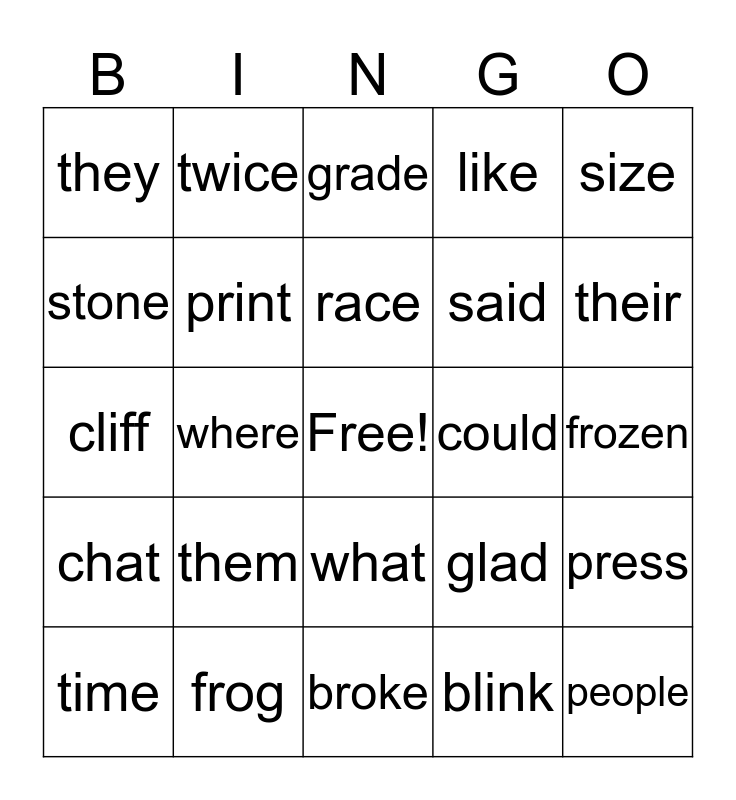 This bingo card has a free space and 24 words: them, frog, race, time, size, they, stone, twice, could, what, said, cliff, glad, press, print, blink, frozen, grade, their, where, people, chat, like and broke.