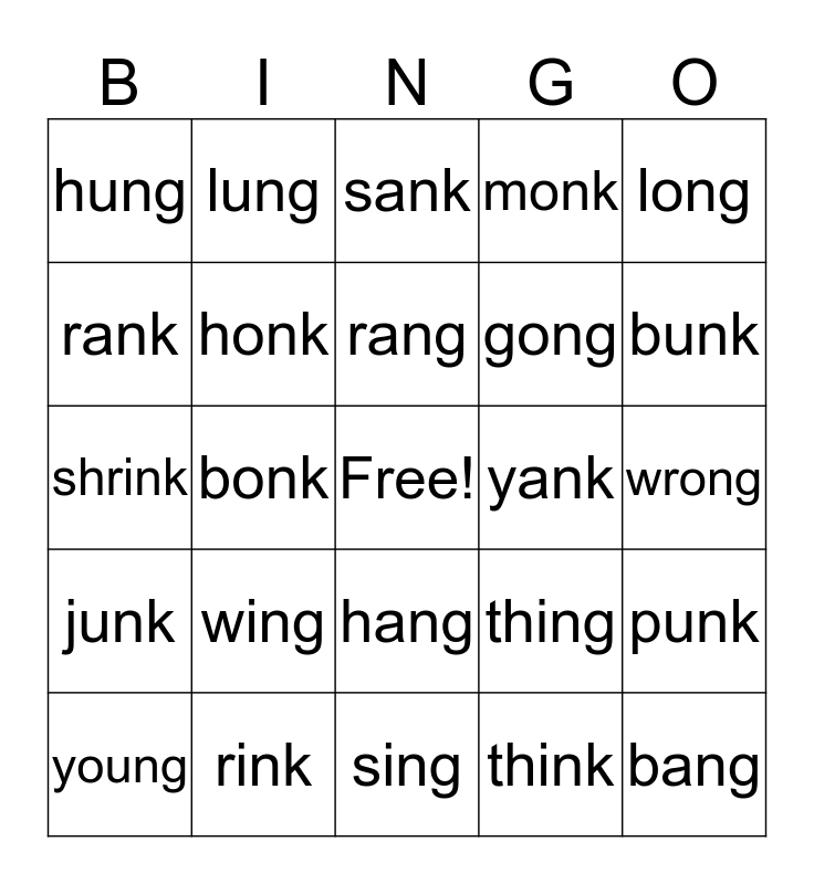 This bingo card has a free space and 24 words: wing, rink, rang, young, long, hung, rank, lung, yank, hang, gong, shrink, thing, punk, honk, think, wrong, sank, bunk, bonk, bang, junk, monk and sing.