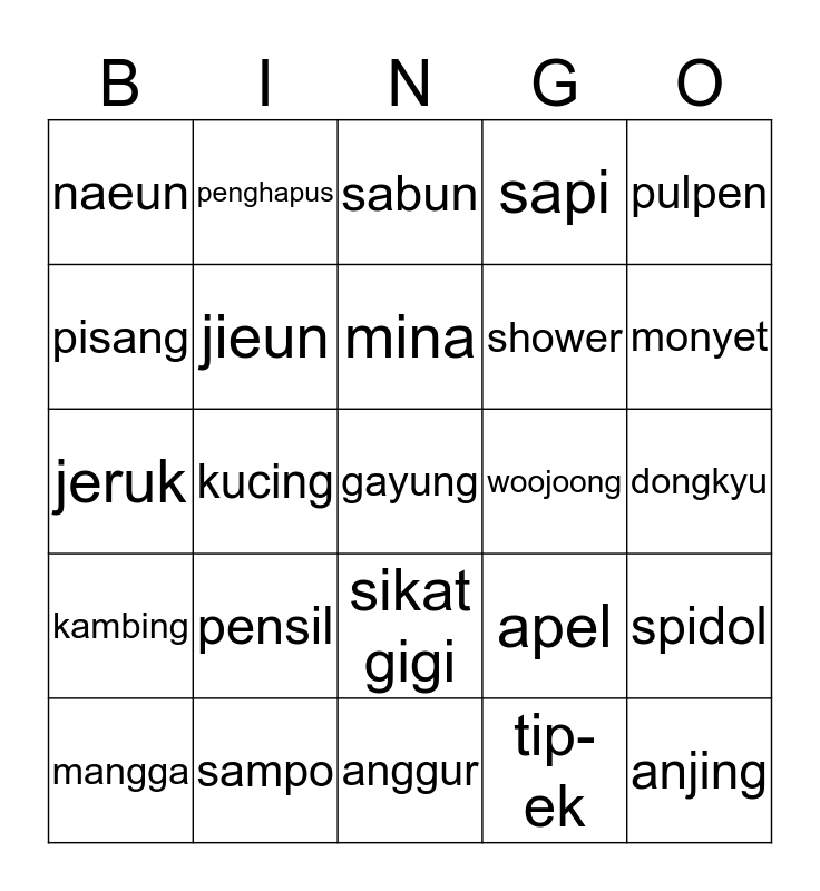 This bingo card has a free space and 24 words: pensil, sampo, mina, mangga, pulpen, naeun, pisang, penghapus, woojoong, sikat gigi, shower, jeruk, apel, spidol, jieun, tip-ek, dongkyu, sabun, monyet, kucing, anjing, kambing, sapi and anggur.