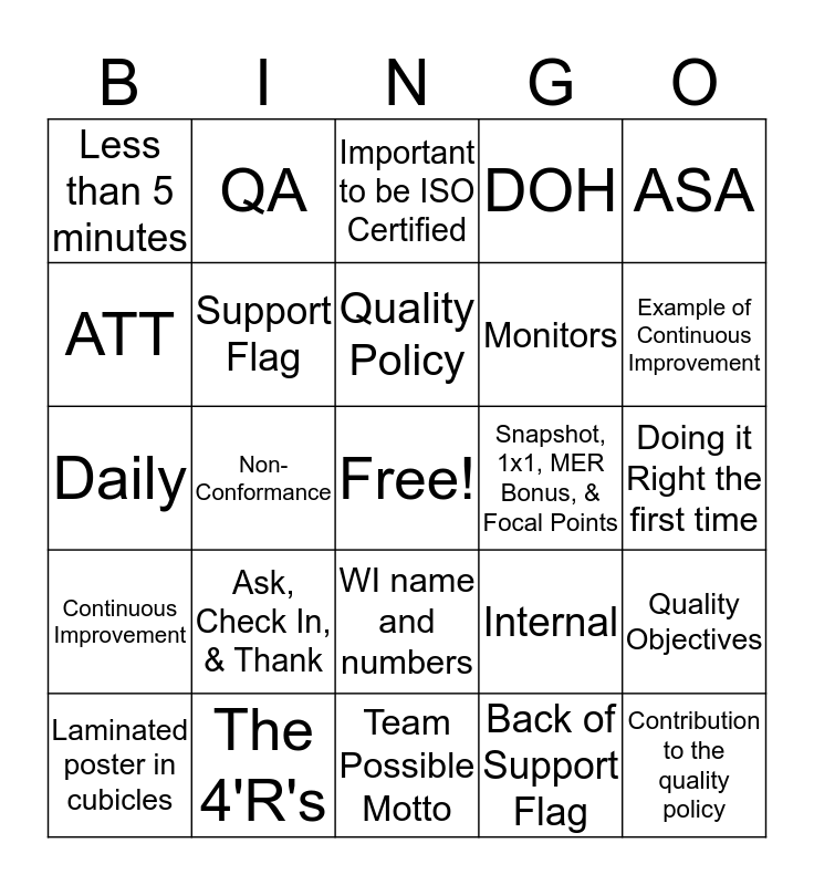This bingo card has a free space and 24 words: Ask, Check In, & Thank, The 4'R's, Quality Policy, Laminated poster in cubicles, ASA, Less than 5 minutes, ATT, QA, Snapshot, 1x1, MER Bonus, & Focal Points, WI name and numbers, Monitors, Daily, Internal, Quality Objectives, Support Flag, Back of Support Flag, Doing it Right the first time, Important to be ISO Certified, Example of Continuous Improvement, Non-Conformance, Contribution to the quality policy, Continuous Improvement, DOH and Team Possible Motto.