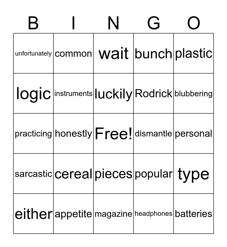 This bingo card has a free space and 24 words: cereal, appetite, luckily, either, plastic, unfortunately, logic, common, dismantle, pieces, Rodrick, practicing, popular, type, instruments, headphones, personal, wait, blubbering, honestly, batteries, sarcastic, bunch and magazine.