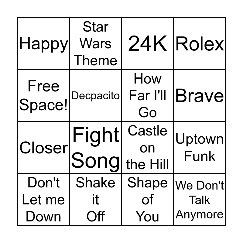 This bingo card has 16 words: Shake it Off, Uptown Funk, 24K, Happy, Closer, Star Wars Theme, Castle on the Hill, Shape of You, Free Space!, Decpacito, Don't Let me Down, Rolex, Fight Song, Brave, How Far I'll Go and We Don't Talk Anymore.