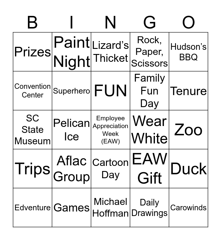 This bingo card has 25 words: Aflac Group, Michael Hoffman, FUN, Edventure, Hudson’s BBQ, Prizes, Convention Center, Paint Night, Wear White, Cartoon Day, Family Fun Day, SC State Museum, EAW Gift, Duck, Superhero, Carowinds, Zoo, Lizard’s Thicket, Tenure, Pelican Ice, Employee Appreciation Week (EAW), Games, Trips, Rock, Paper, Scissors and Daily Drawings.