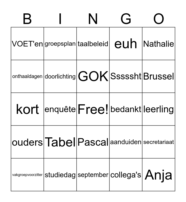 This bingo card has a free space and 27 words: aanduiden, Smartschool, Sssssht, september, onthaaldagen, taalbeleid, groepsplan, ouders, bedankt, secretariaat, kort, euh, vakgroepvoorzitter, studiedag, Brussel, vergadering, doorlichting, GOK, Tabel, VOET'en, leerling, collega's, enquête, Anja, Pascal, Nathalie and directie.
