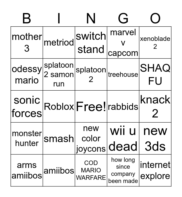 This bingo card has a free space and 24 words: smash, amiibos, splatoon 2, arms amiibos, xenoblade 2, mother 3, odessy mario, metriod, rabbids, new color joycons, treehouse, sonic forces, wii u dead, new 3ds, splatoon 2 samon run, how long since company been made, knack 2, switch stand, SHAQ FU, Roblox, internet explore, monster hunter, marvel v capcom and COD MARIO WARFARE.