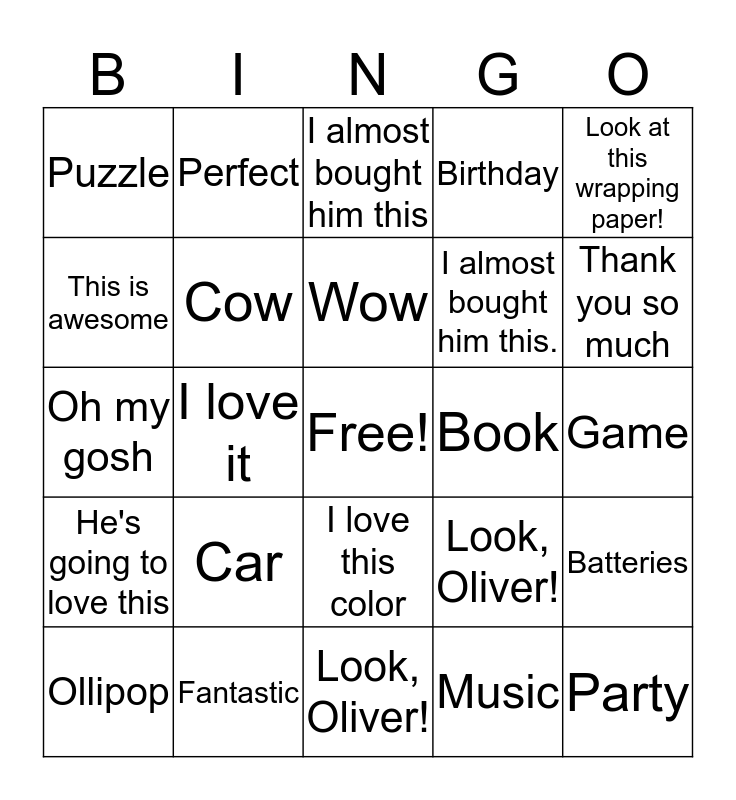 This bingo card has a free space and 27 words: Look, Oliver!, This is awesome!, I almost bought him this., Look, Oliver!, This is awesome, I almost bought him this, Perfect, He's going to love this, Book, Batteries, Oh my gosh, Birthday, Ollipop, Fantastic, Thank you so much, Where did you find this?, Cow, Wow, Car, Puzzle, Game, Music, I love it, Party, I love this color, Look at this wrapping paper! and So cute.