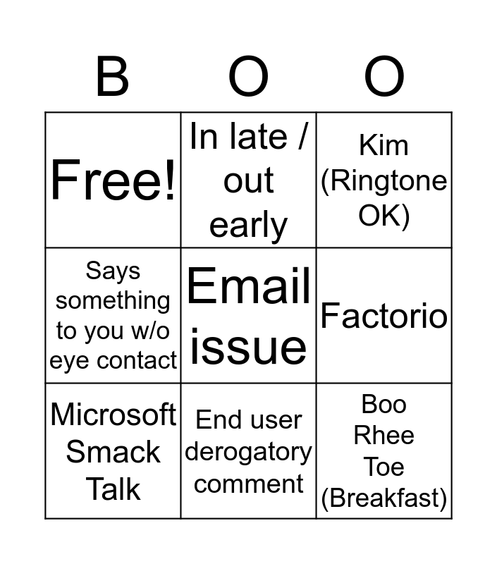 This bingo card has a free space and 8 words: Factorio, Kim (Ringtone OK), In late / out early, Microsoft Smack Talk, Free!, Boo Rhee Toe (Breakfast), Says something to you w/o eye contact and End user derogatory comment.