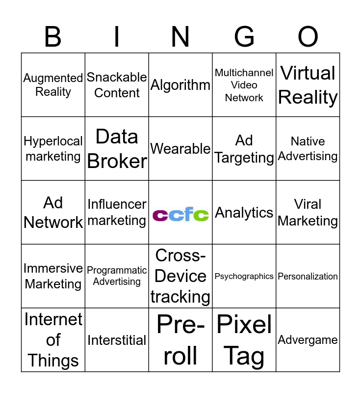 This bingo card has a free space and 24 words: Programmatic Advertising, Interstitial, Wearable, Internet of Things, Virtual Reality, Augmented Reality, Hyperlocal marketing, Snackable Content, Analytics, Cross-Device tracking, Ad Targeting, Ad Network, Psychographics, Personalization, Data Broker, Pixel Tag, Viral Marketing, Algorithm, Native Advertising, Influencer marketing, Advergame, Immersive Marketing, Multichannel Video Network and Pre-roll.