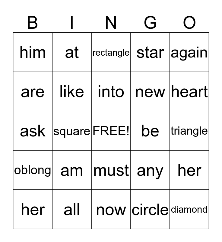This bingo card has a free space and 24 words: am, all, into, her, again, him, are, at, be, must, new, ask, any, her, like, circle, triangle, rectangle, heart, square, diamond, oblong, star and now.