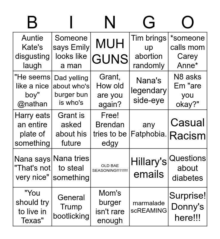 This bingo card has a free space and 24 words: Nana tries to steal something, General Trump bootlicking, Grant, How old are you again?, "You should try to live in Texas", *someone calls mom Carey Anne*, Auntie Kate's disgusting laugh, "He seems like a nice boy" @nathan, Someone says Emily looks like a man, any Fatphobia., OLD BAE SEASONING!!11!!!!, Nana's legendary side-eye, Harry eats an entire plate of something, Hillary's emails, Questions about diabetes, Dad yelling about who's burger bun is who's, marmalade scREAMING, Casual Racism, MUH GUNS, N8 asks Em "are you okay?", Grant is asked about his future, Surprise! Donny's here!!!, Nana says "That's not very nice", Tim brings up abortion randomly and Mom's burger isn't rare enough.