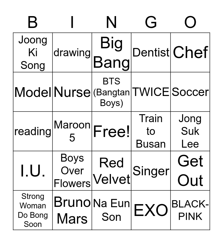 This bingo card has a free space and 24 words: Boys Over Flowers, Bruno Mars, BTS (Bangtan Boys), Strong Woman Do Bong Soon, Chef, Joong Ki Song, Model, drawing, Train to Busan, Red Velvet, TWICE, reading, Singer, Get Out, Nurse, EXO, Jong Suk Lee, Big Bang, Soccer, Maroon 5, BLACK-PINK, I.U., Dentist and Na Eun Son.