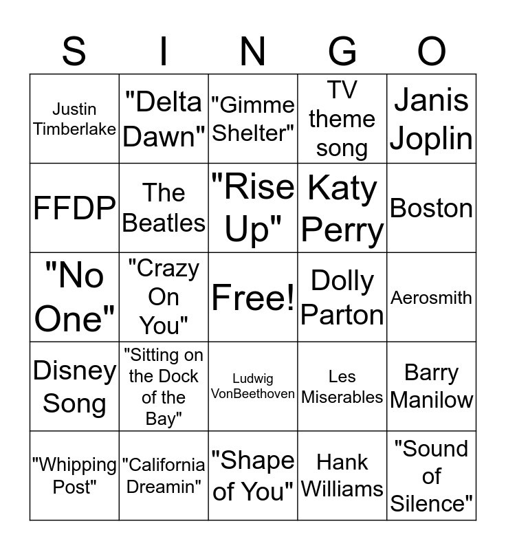 This bingo card has a free space and 24 words: "Sitting on the Dock of the Bay", "California Dreamin", "Rise Up", "Whipping Post", Janis Joplin, Justin Timberlake, FFDP, "Delta Dawn", Dolly Parton, Ludwig VonBeethoven, Katy Perry, "No One", Les Miserables, Barry Manilow, The Beatles, Hank Williams, Aerosmith, "Gimme Shelter", Boston, "Crazy On You", "Sound of Silence", Disney Song, TV theme song and "Shape of You".