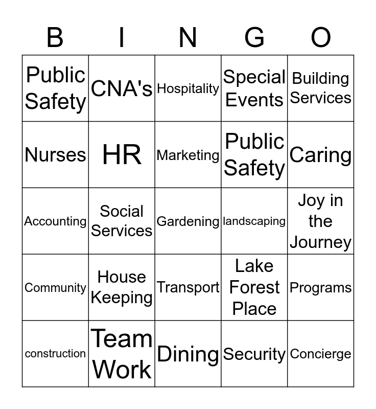 This bingo card has 25 words: House Keeping, Dining, Marketing, construction, Building Services, Public Safety, Nurses, CNA's, landscaping, Transport, Public Safety, Accounting, Lake Forest Place, Programs, HR, Concierge, Joy in the Journey, Hospitality, Caring, Social Services, Gardening, Team Work, Community, Special Events and Security.