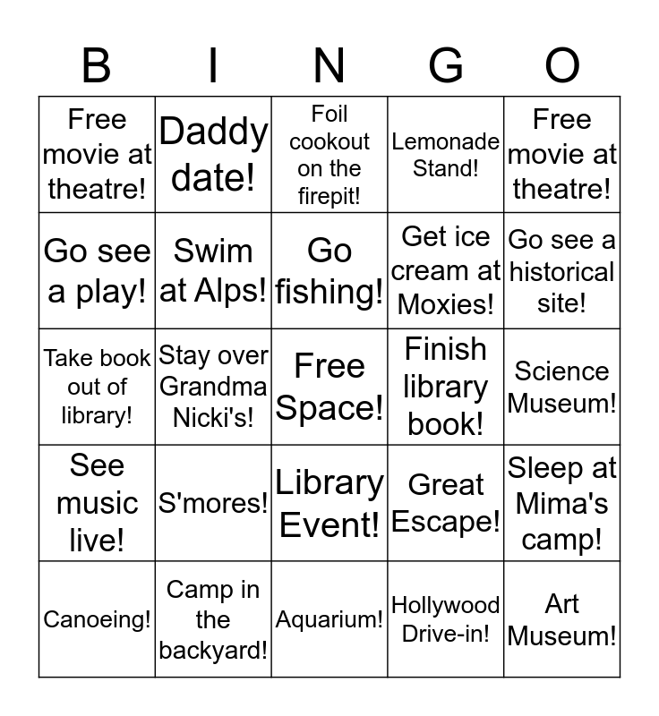 This bingo card has a free space and 24 words: S'mores!, Camp in the backyard!, Go fishing!, Canoeing!, Free movie at theatre!, Free movie at theatre!, Go see a play!, Daddy date!, Finish library book!, Library Event!, Get ice cream at Moxies!, Take book out of library!, Great Escape!, Sleep at Mima's camp!, Swim at Alps!, Hollywood Drive-in!, Science Museum!, Foil cookout on the firepit!, Go see a historical site!, Stay over Grandma Nicki's!, Art Museum!, See music live!, Lemonade Stand! and Aquarium!.