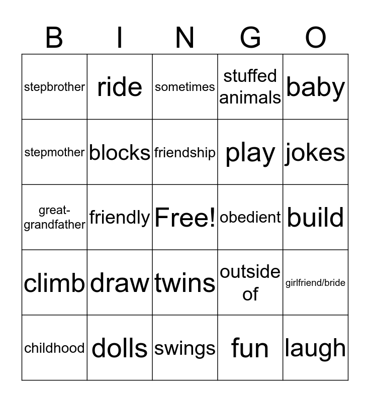 This bingo card has a free space and 29 words: childhood, shy, friendly, relative, stepbrother, sometimes, blocks, draw, obedient, dolls, build, laugh, swings, fun, jokes, jump, twins, climb, baby, great-grandfather, outside of, friendly, play, stepmother, stuffed animals, ride, girlfriend/bride, friendship and nap.