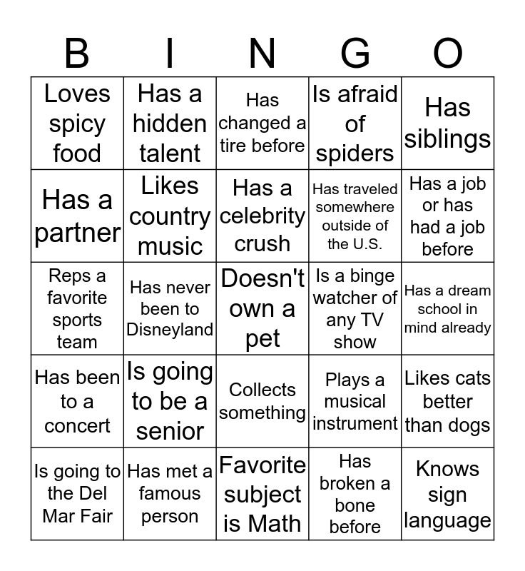 This bingo card has a free space and 24 words: Is going to be a senior, Has met a famous person, Has a celebrity crush, Is going to the Del Mar Fair, Has siblings, Loves spicy food, Has a partner, Has a hidden talent, Is a binge watcher of any TV show, Collects something, Has traveled somewhere outside of the U.S., Reps a favorite sports team, Plays a musical instrument, Likes cats better than dogs, Likes country music, Has broken a bone before, Has a dream school in mind already, Has changed a tire before, Has a job or has had a job before, Has never been to Disneyland, Knows sign language, Has been to a concert, Is afraid of spiders and Favorite subject is Math.