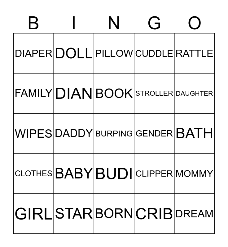This bingo card has a free space and 24 words: BABY, STAR, BOOK, GIRL, RATTLE, DIAPER, FAMILY, DOLL, GENDER, BUDI, STROLLER, WIPES, CLIPPER, MOMMY, DIAN, CRIB, BATH, PILLOW, DAUGHTER, DADDY, DREAM, CLOTHES, CUDDLE and BORN.