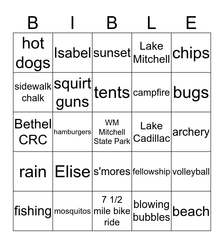 This bingo card has a free space and 24 words: Elise, mosquitos, tents, fishing, chips, hot dogs, sidewalk chalk, Isabel, Lake Cadillac, s'mores, campfire, Bethel CRC, fellowship, volleyball, squirt guns, blowing bubbles, archery, sunset, bugs, hamburgers, beach, rain, Lake Mitchell and 7 1/2 mile bike ride.