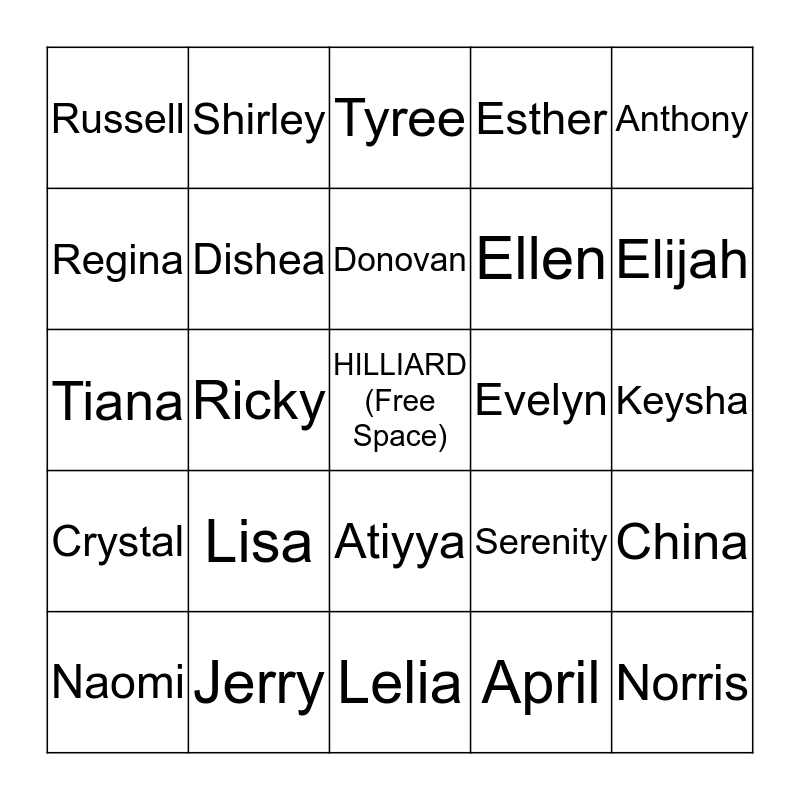 This bingo card has a free space and 24 words: Lisa, Jerry, Donovan, Naomi, Anthony, Russell, Regina, Shirley, Evelyn, Atiyya, Ellen, Tiana, Serenity, China, Dishea, April, Keysha, Tyree, Elijah, Ricky, Norris, Crystal, Esther and Lelia.