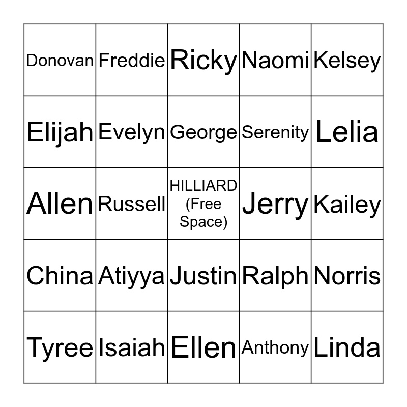 This bingo card has a free space and 24 words: Atiyya, Isaiah, George, Tyree, Kelsey, Donovan, Elijah, Freddie, Jerry, Justin, Serenity, Allen, Ralph, Norris, Evelyn, Anthony, Kailey, Ricky, Lelia, Russell, Linda, China, Naomi and Ellen.