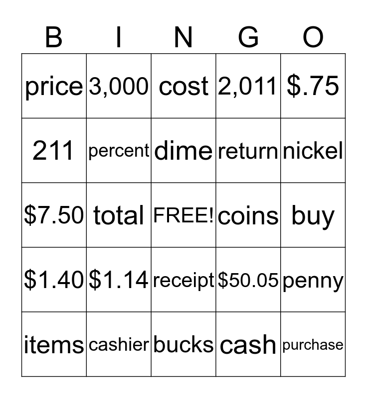 This bingo card has a free space and 30 words: cashier, change, total, tax, price, cost, percent, receipt, coins, bucks, buy, purchase, cash, customer, nickel, $15.75, $50.05, $1.40, $1.14, $.75, $7.50, 300, 3,000, return, 211, 2,011, penny, items, dime and quarter.