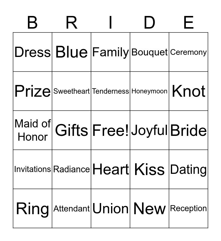 This bingo card has a free space and 69 words: Prize, Bride, Affection, Aisle, Attendant, Bachelor, Bouquet, Boutonniere, Ceremony, Couple, Dating, Diamond, Dress, Family, Forever, Gifts, Heart, Honeymoon, Husband, Invitations, Joyful, Kiss, Knot, Fiance, Dance, Lace, License, Old, New, Borrowed, Blue, Traditions, Penny, Love, Marriage, Memories, Nervous, Party, Prize, Quality, Radiance, Reception, Relatives, Friends, Rice, Ring, Romantic, Shower, Special, Sweetheart, Tenderness, Together, Tuxedo, Union, Veil, Vows, Wedding, Wife, Witness, Maid of Honor, Best Man, Engagement, Dream, Celebration, Pastor, Happiness, Save the Date, White and Serenity.
