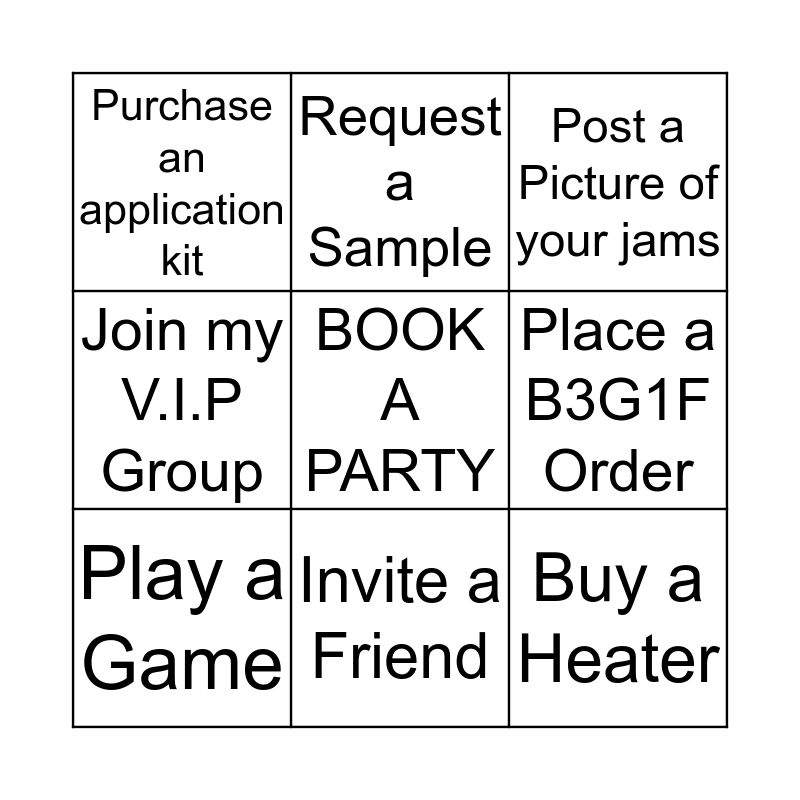 This bingo card has a free space and 8 words: Place a B3G1F Order, Post a Picture of your jams, Request a Sample, Play a Game, Purchase an application kit, Buy a Heater, Join my V.I.P Group and Invite a Friend.