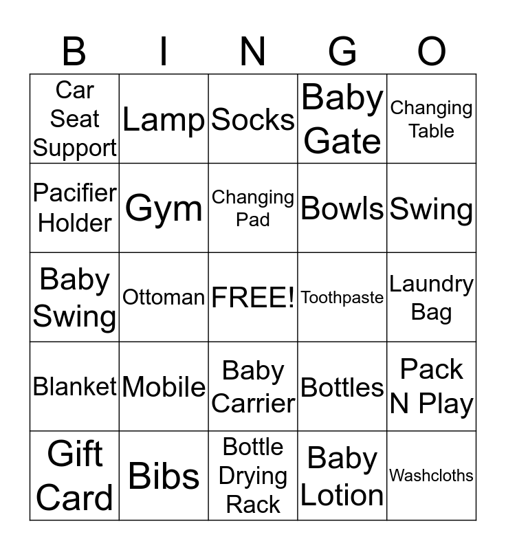 This bingo card has a free space and 24 words: Mobile, Bibs, Changing Pad, Gift Card, Changing Table, Car Seat Support, Pacifier Holder, Lamp, Toothpaste, Baby Carrier, Bowls, Baby Swing, Bottles, Pack N Play, Gym, Baby Lotion, Laundry Bag, Socks, Swing, Ottoman, Washcloths, Blanket, Baby Gate and Bottle Drying Rack.