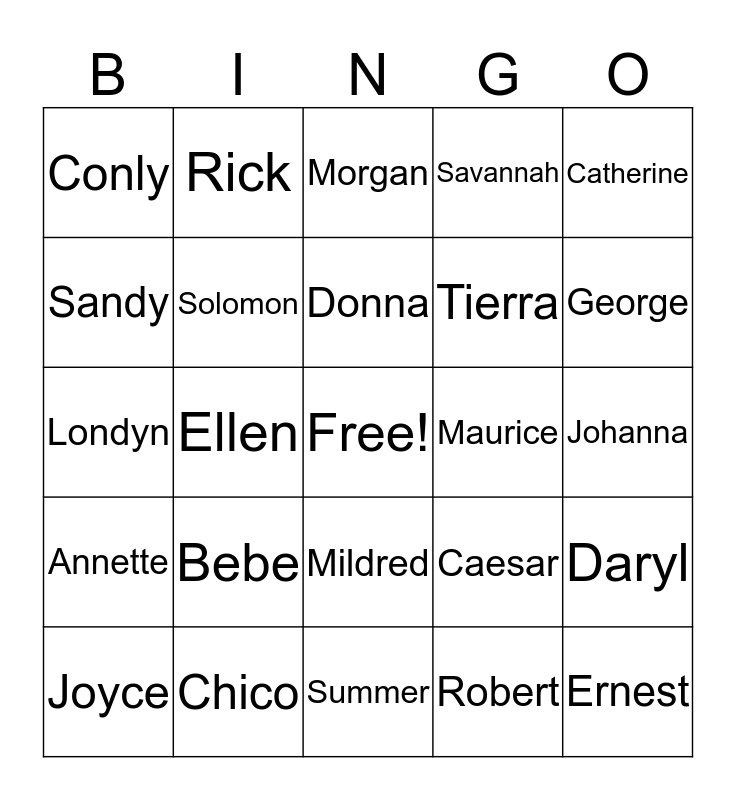 This bingo card has a free space and 47 words: Gladys, Ernest, Michael, Summer, Bebe, Phyllis, Rick, Evelyn, Sandy, Sheldon, Solomon, Savannah, Daryl, Caesar, Savoy, Vernette, Donna, Maurice, Ravelle, Catherine, Ellen, Robert, Conly, Tierra, Keisha, George, Joyce, Kevin, Mildred, Annette, Anja, John, Steph, Jesse, Aunt Ann, Chico, Johanna, Ela, Mae, Jess, Tommada, Morgan, Londyn, AJ, Seraphina, Sydney and Dillon.