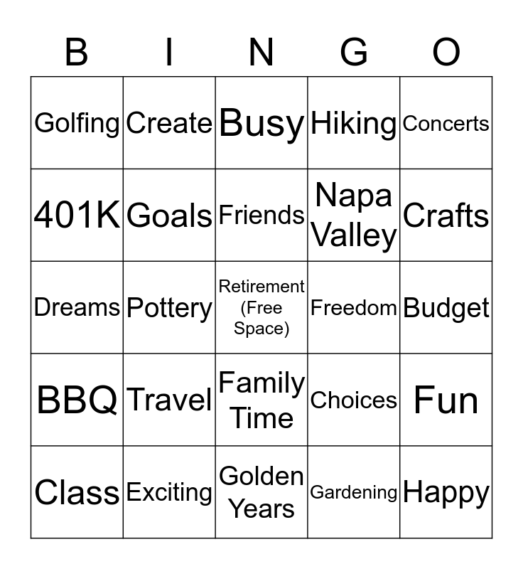 This bingo card has a free space and 24 words: Travel, Exciting, Friends, Class, Concerts, Golfing, 401K, Create, Freedom, Family Time, Napa Valley, Dreams, Choices, Fun, Goals, Gardening, Budget, Busy, Crafts, Pottery, Happy, BBQ, Hiking and Golden Years.