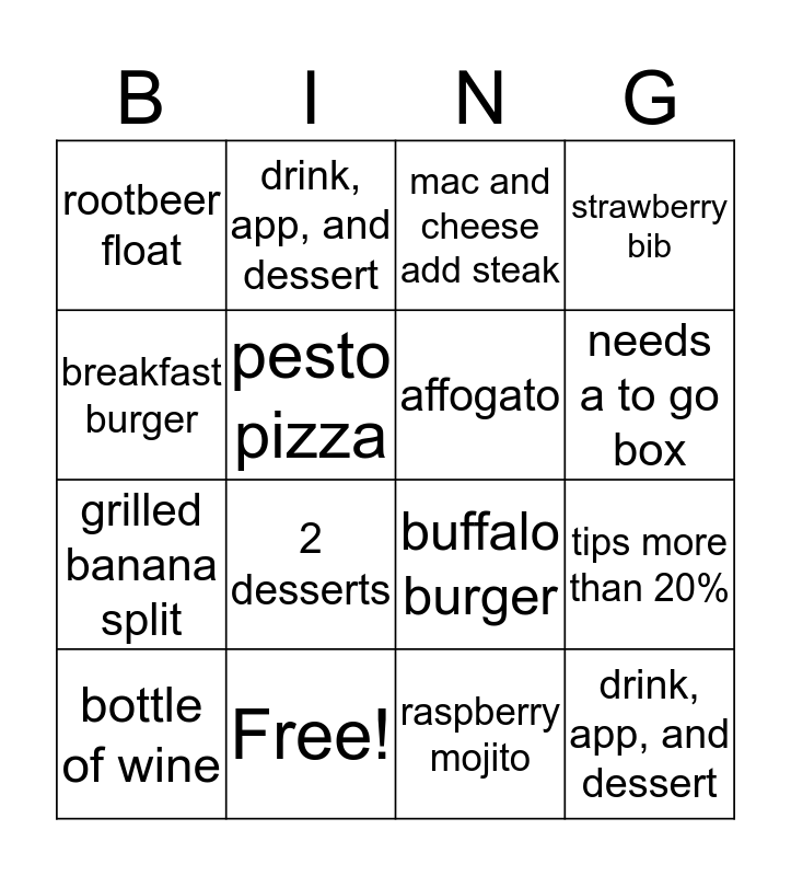 This bingo card has 25 words: 2 appetizers, orders off the inside menu, needs a to go box, more than 4 beers, breakfast burger, rootbeer float, pesto pizza, drink, app, and dessert, Free!, asks for more ranch, grilled banana split, buffalo burger, personal and large pizza, blue cheese burger, affogato, cheese steak quesadilla, raspberry mojito, mac and cheese add steak, 2 desserts, tips more than 20%, bottle of wine, buffalo burger, drink, app, and dessert, strawberry bib and more than 4 beers.