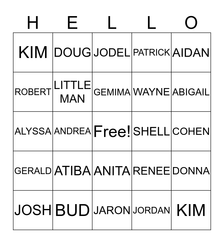 This bingo card has a free space and 24 words: ATIBA, BUD, GEMIMA, JOSH, AIDAN, KIM, ROBERT, DOUG, SHELL, ANITA, WAYNE, ALYSSA, RENEE, DONNA, LITTLE MAN, JORDAN, COHEN, JODEL, ABIGAIL, ANDREA, KIM, GERALD, PATRICK and JARON.