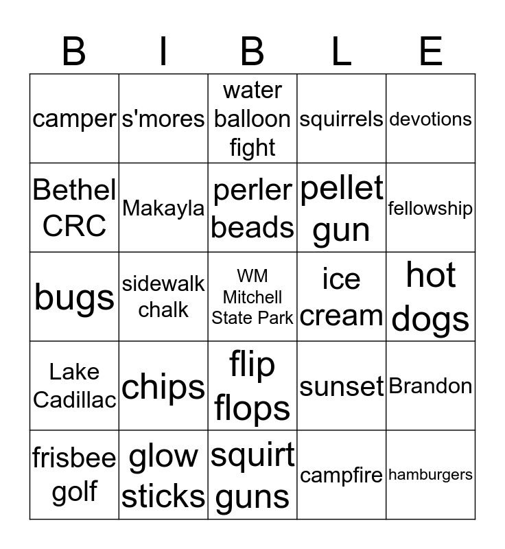 This bingo card has a free space and 24 words: chips, glow sticks, perler beads, frisbee golf, devotions, camper, Bethel CRC, s'mores, ice cream, flip flops, pellet gun, bugs, sunset, Brandon, Makayla, campfire, hot dogs, water balloon fight, fellowship, sidewalk chalk, hamburgers, Lake Cadillac, squirrels and squirt guns.