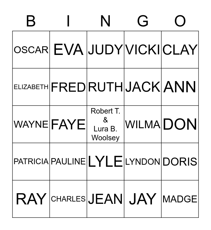 This bingo card has a free space and 24 words: PAULINE, CHARLES, RUTH, RAY, CLAY, OSCAR, ELIZABETH, EVA, WILMA, LYLE, JACK, WAYNE, LYNDON, DORIS, FRED, JAY, DON, JUDY, ANN, FAYE, MADGE, PATRICIA, VICKI and JEAN.