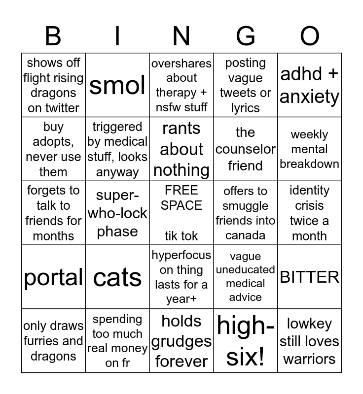 This bingo card has a free space and 24 words: cats, spending too much real money on fr, rants about nothing, only draws furries and dragons, adhd + anxiety, shows off flight rising dragons on twitter, buy adopts, never use them, smol, offers to smuggle friends into canada, hyperfocus on thing lasts for a year+, the counselor friend, forgets to talk to friends for months, vague uneducated medical advice, BITTER, triggered by medical stuff, looks anyway, high-six!, identity crisis twice a month, overshares about therapy + nsfw stuff, weekly mental breakdown, super-who-lock phase, lowkey still loves warriors, portal, posting vague tweets or lyrics and holds grudges forever.