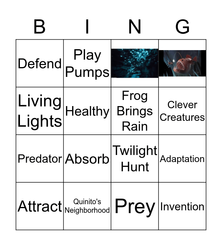 This bingo card has 2 images and 14 words: Quinito's Neighborhood, Adaptation, Defend, Predator, Play Pumps, Twilight Hunt, Prey, Living Lights, Healthy, Attract, Absorb, Clever Creatures, Frog Brings Rain and Invention.