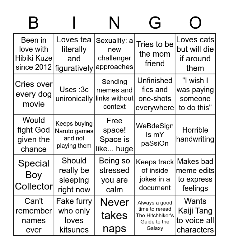 This bingo card has a free space and 24 words: Should really be sleeping right now, Fake furry who only loves kitsunes, Sending memes and links without context, Can't remember names ever, Loves cats but will die if around them, Been in love with Hibiki Kuze since 2012, Cries over every dog movie, Loves tea literally and figuratively, WeBdeSign Is mY paSsiOn, Being so stressed you are calm, Unfinished fics and one-shots everywhere, Would fight God given the chance, Keeps track of inside jokes in a document, Makes bad meme edits to express feelings, Uses :3c unironically, Always a good time to reread The Hitchhiker's Guide to the Galaxy, Horrible handwriting, Sexuality: a new challenger approaches, "I wish I was paying someone to do this", Keeps buying Naruto games and not playing them, Wants Kaiji Tang to voice all characters, Special Boy Collector, Tries to be the mom friend and Never takes naps.